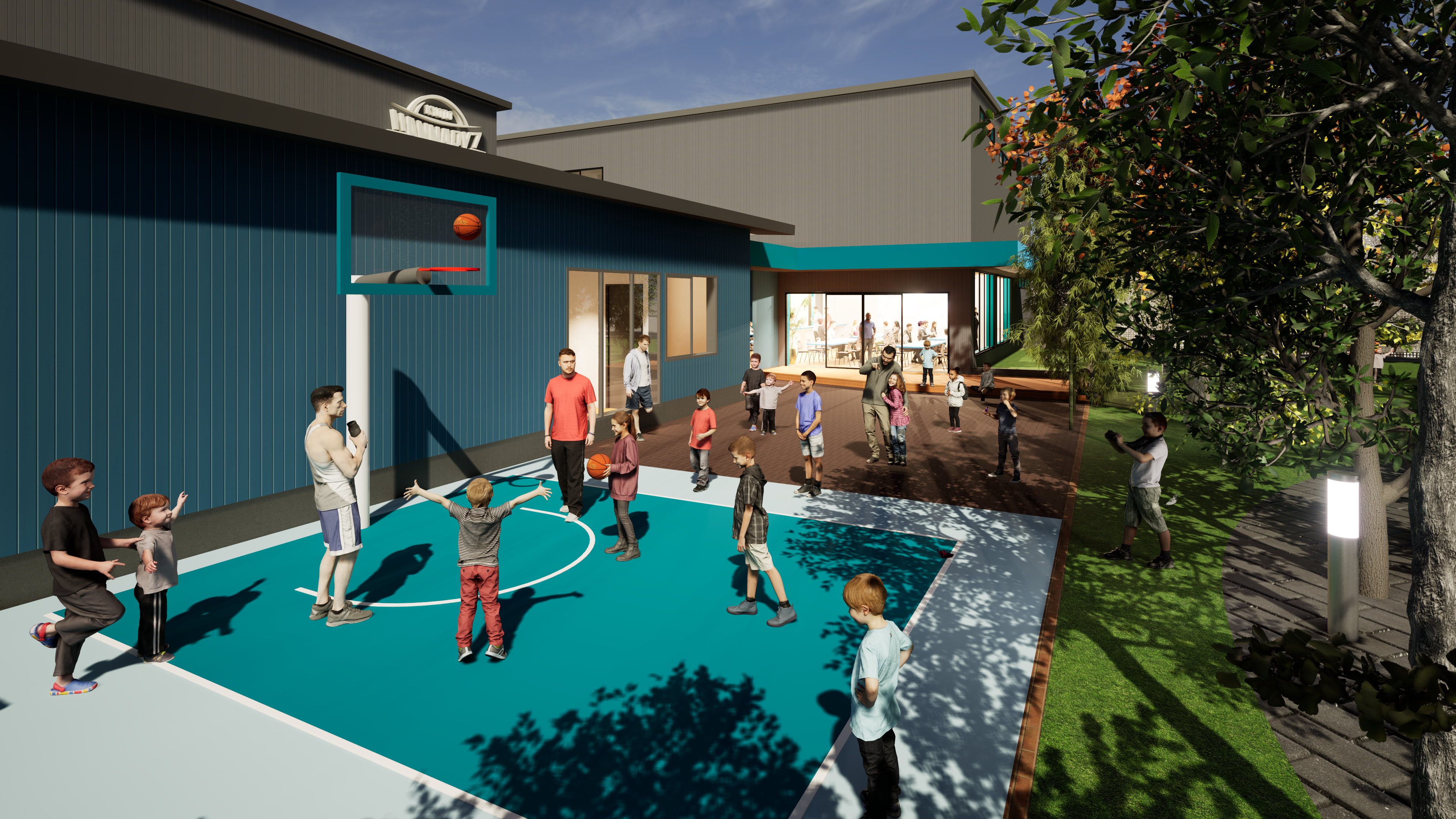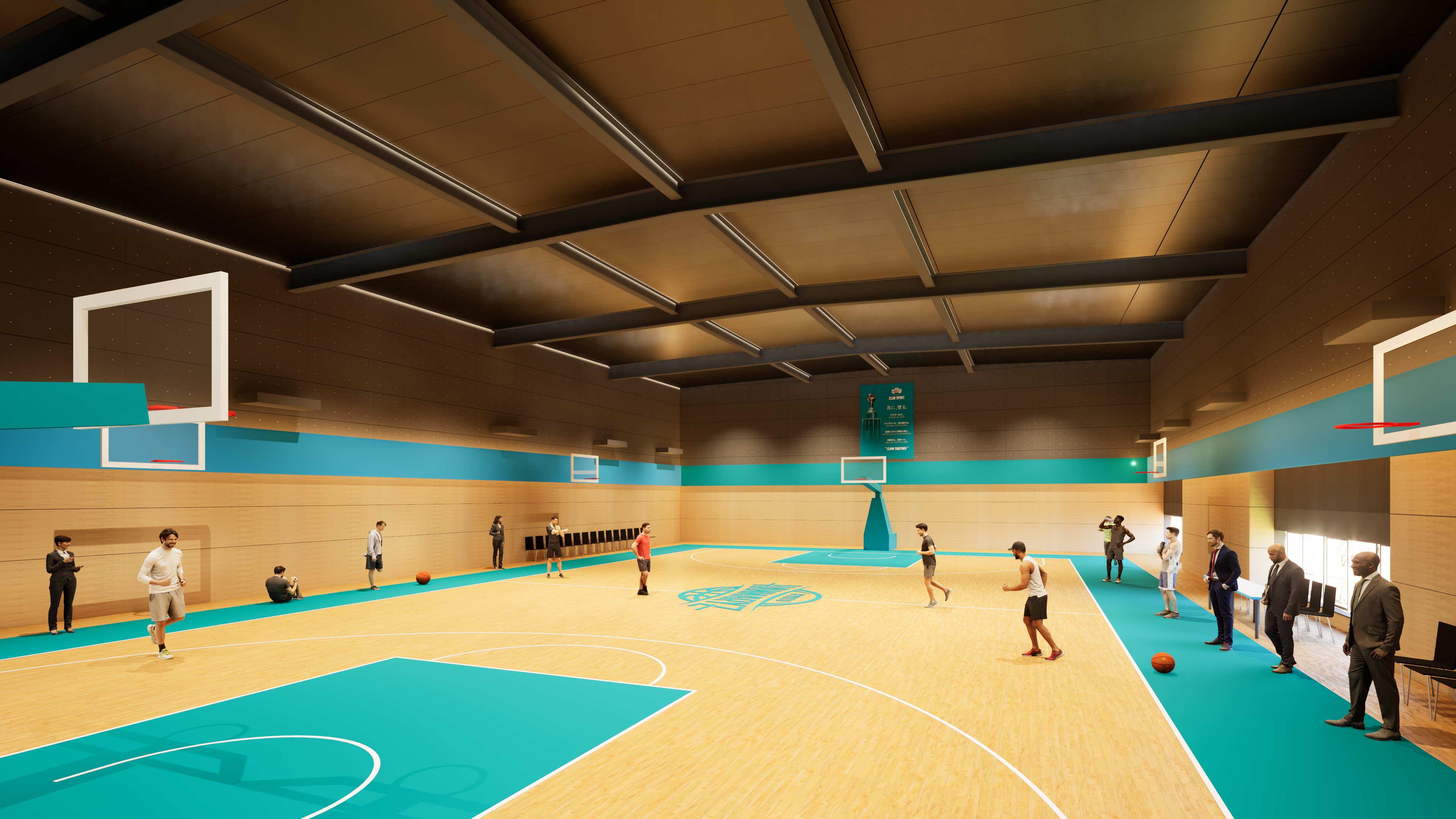 敷地は「練習棟」「選手棟」「屋外広場」の2棟1広場で構成されます。北側隣地への圧迫感軽減に配慮した配置とし、公園に面する敷地の一部に屋外バスケットゴール付きの「広場」を設けることで、地域の人々や子どもたちが日常的に利用できる開かれた空間を提供します。セキュリティは、選手の練習時、ユースの練習時、それぞれで適切なゾーニング(区分)を行い、選手が集中できる環境と地域への開放性を両立させます。