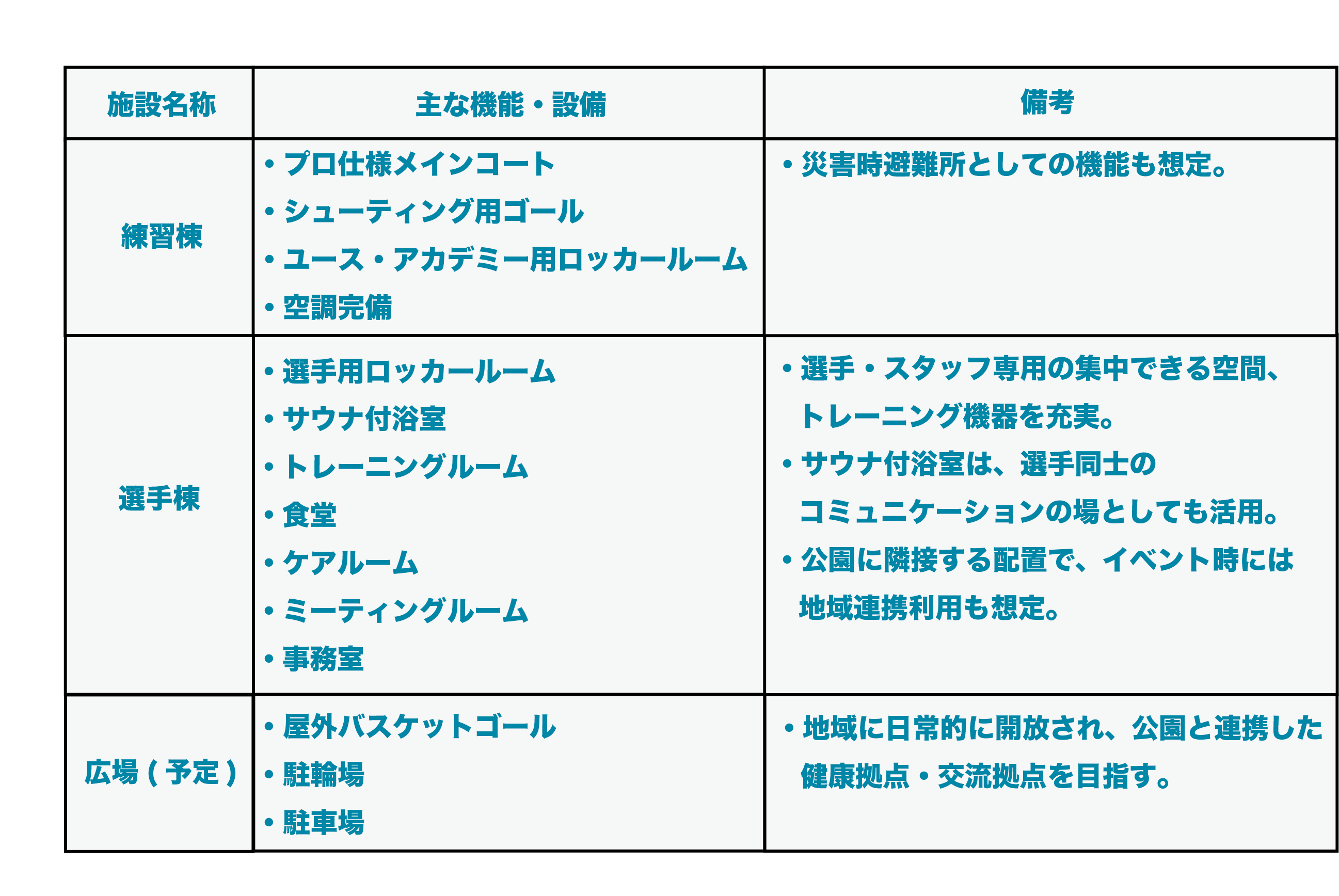 採択された提案に基づき、最新のトレーニング環境と地域貢献機能を両立させた以下の施設を計画します。