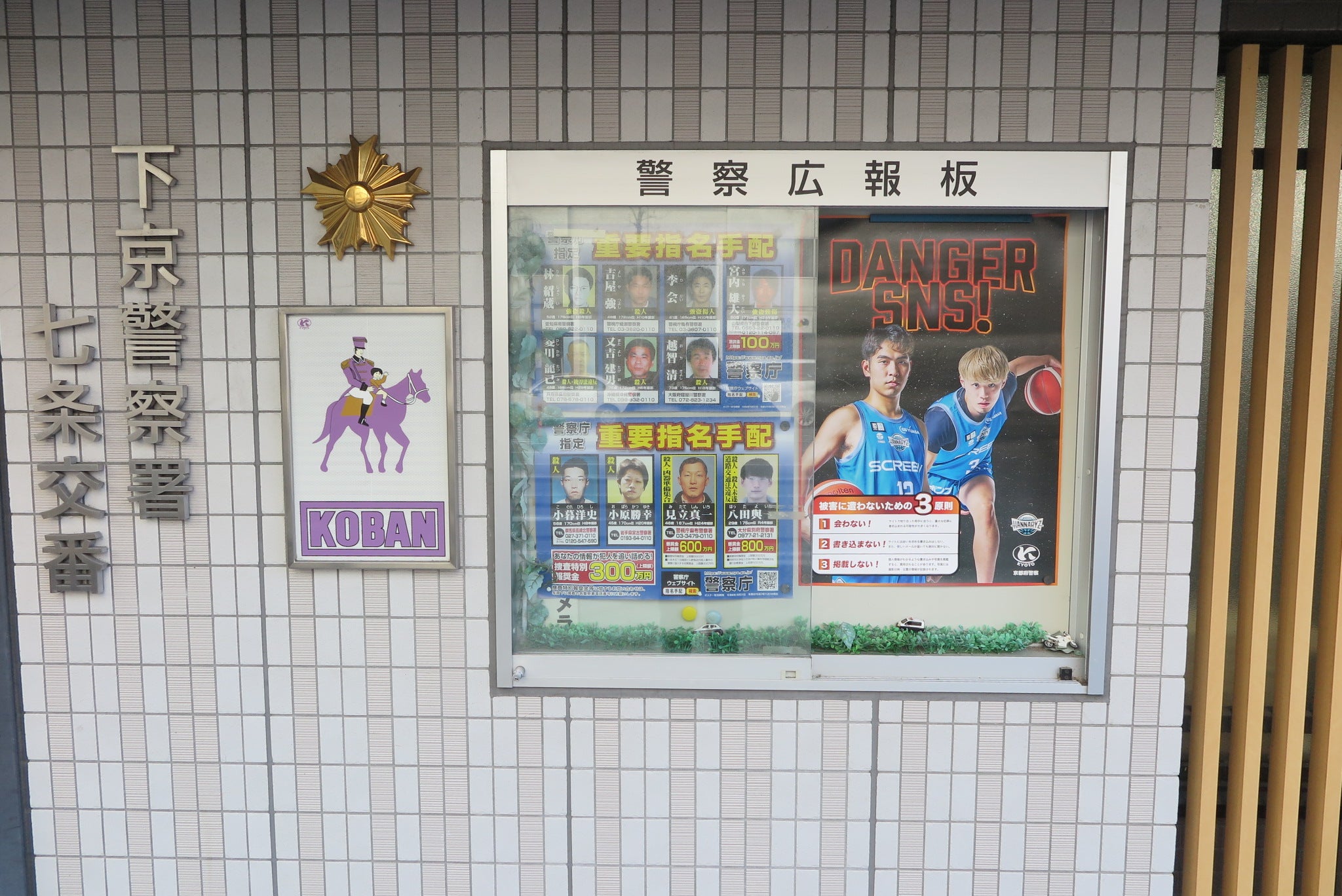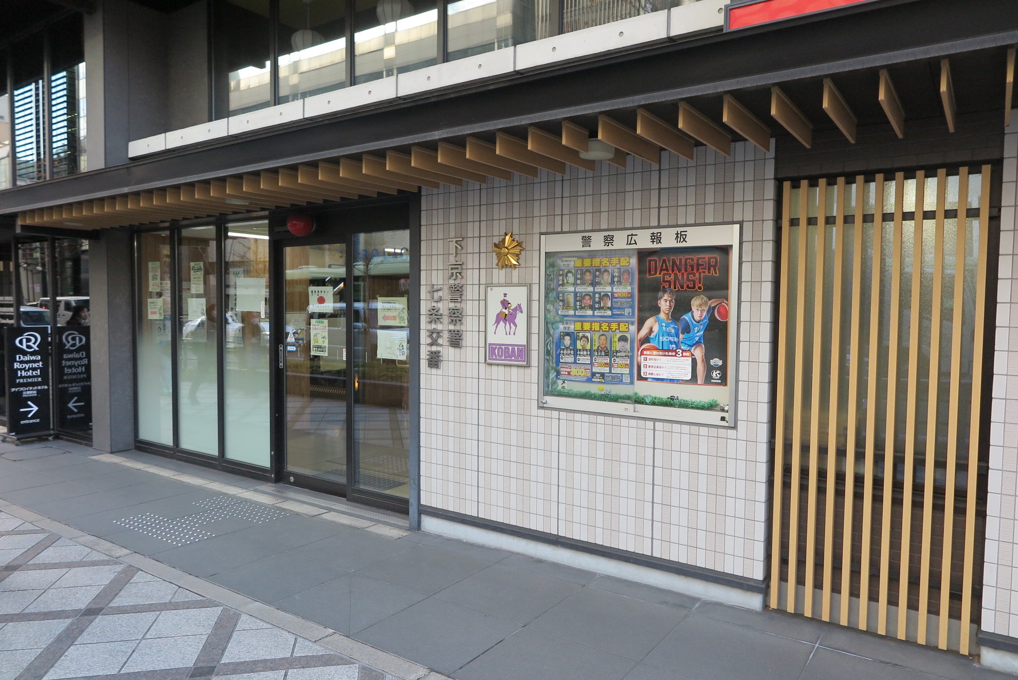 写真の施設は、京都市立四条中学校、下京警察署七条交番です。