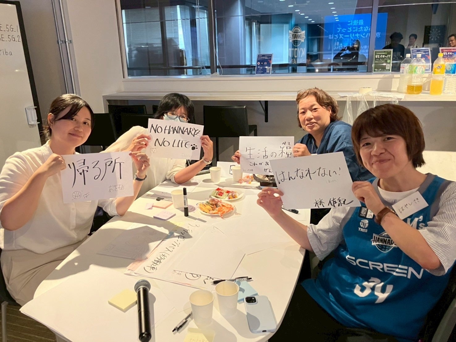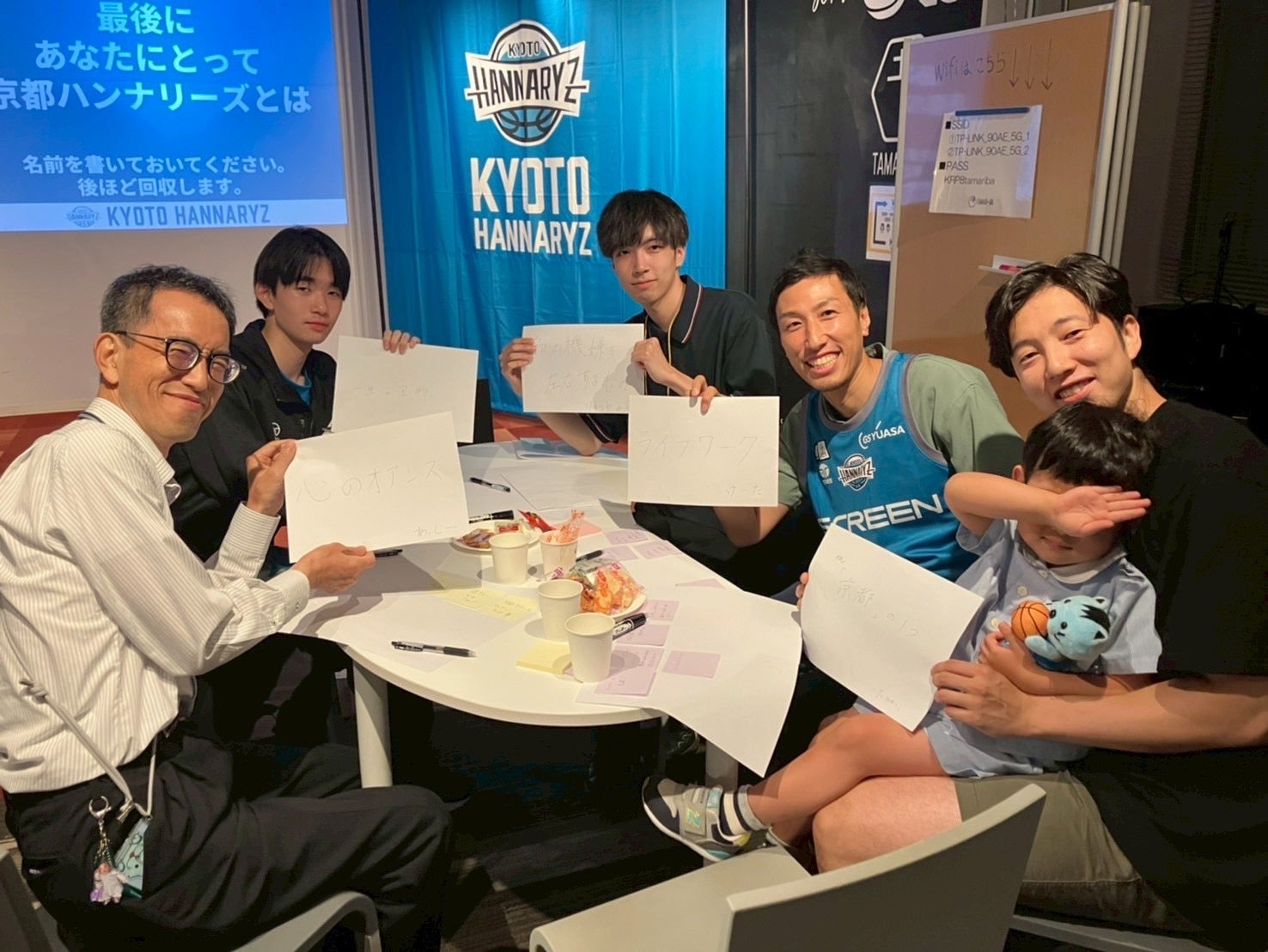 交流会の最後には、「あなたにとって京都ハンナリーズとは?」という問いかけに、参加者の皆さまに一言で答えていただきました。その回答を手に、皆さまと一緒に記念撮影を行い、ひとりひとりの想いが形となる特別な時間を共有することができました。