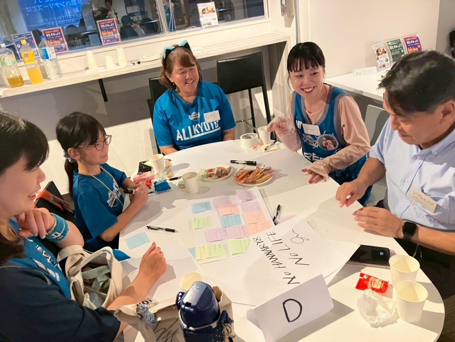 ワーク①では、「京都ハンナリーズのここにハマった!」をテーマにグループごとにお話しいただきました。選手が躍動するアリーナの熱気やファン・ブースターの皆さまのあたたかさ、はんニャリンのかわいさ、そしてフロントスタッフのおもてなし精神(!)まで…幅広い“推しポイント”が飛び出し、会場は笑顔でいっぱいになりました。
