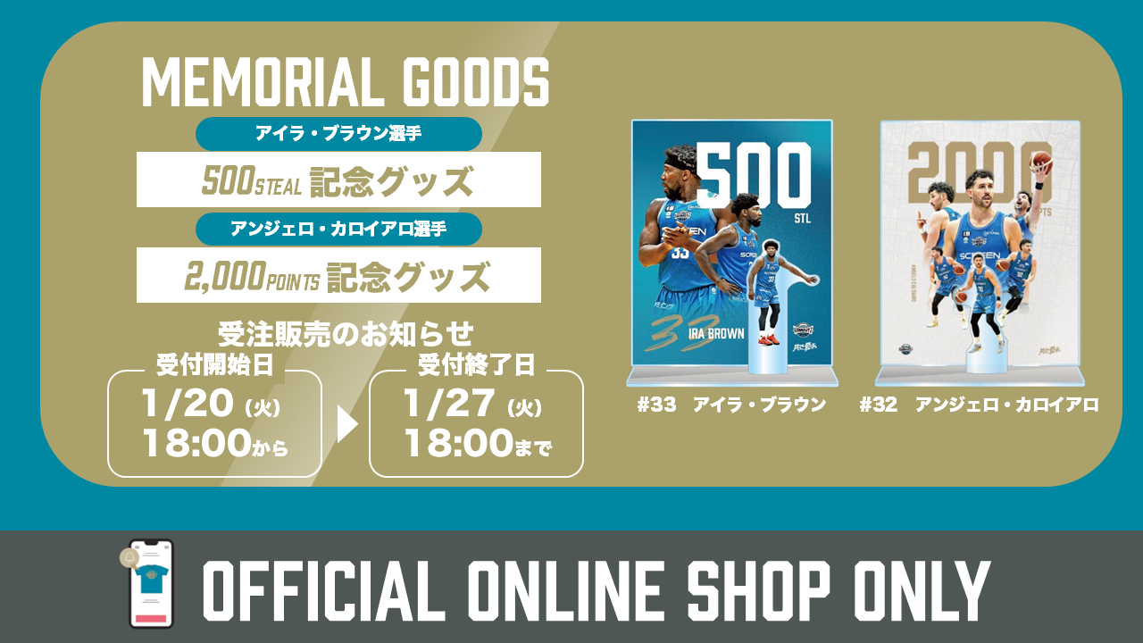 いつも京都ハンナリーズに熱いご声援をいただきまして、誠にありがとうございます。 この度、下記の記録達成に伴う記念アクリルパネルを販売することが決定いたしました。 【対象選手・記録】 ■アイラ・ブラウン選手 通算500スティール達成 ■アンジェロ・カロイアロ選手 通算2000得点達成 期間限定・オンラインショップ限定の受注販売ですので、この機会にお買い求めください。 【商品情報】 ■アイラ・ブラウン選手 通算500スティール達成記念アクリルパネル 価格:3,000円(税込) ■アンジェロ・カロイアロ選手 通算2000得点達成記念アクリルパネル 価格:3,000円(税込)