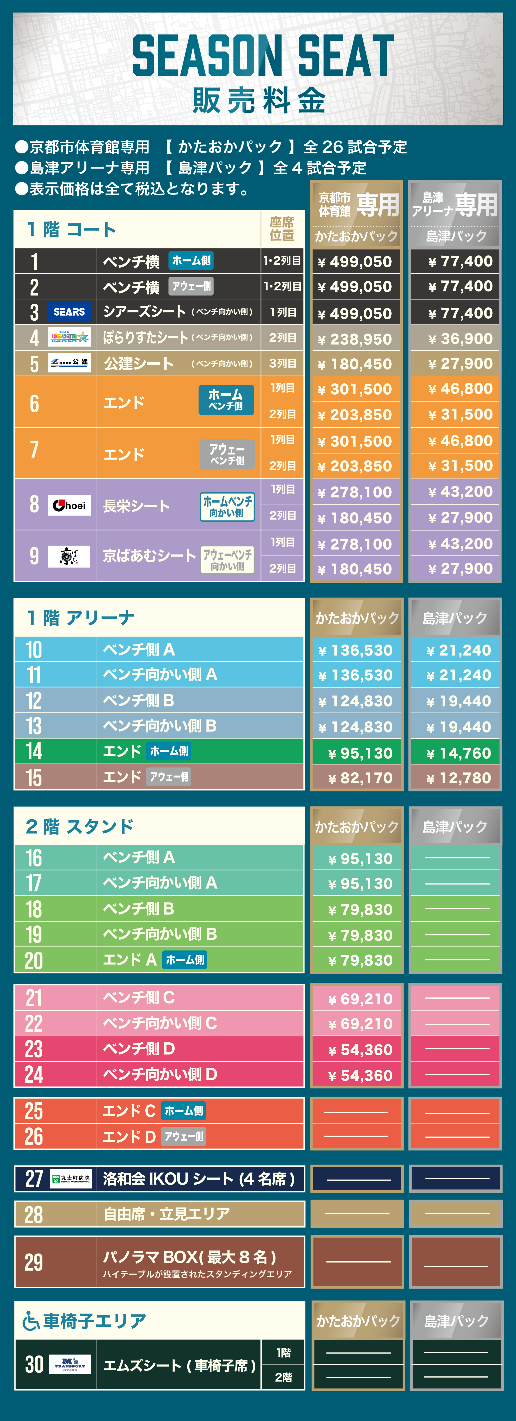 ・通常販売での販売席の確保のため、シーズンシートで全ての席は販売いたしません。